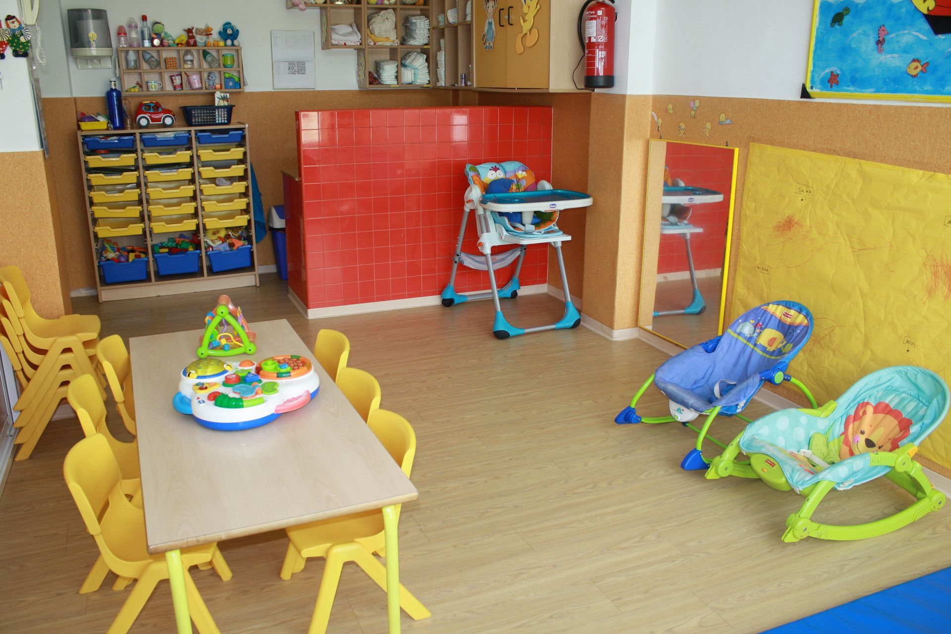 En esta aula con su zona de aseo, zona de juego y zona de descanso, se desarrollan actividades para su estimulación sensorial, experimentación, manipulación de objetos, estimulación del lenguaje, desarrollo de su autonomía, pero siempre respetando los ritmos biológicos de cada niño/a.