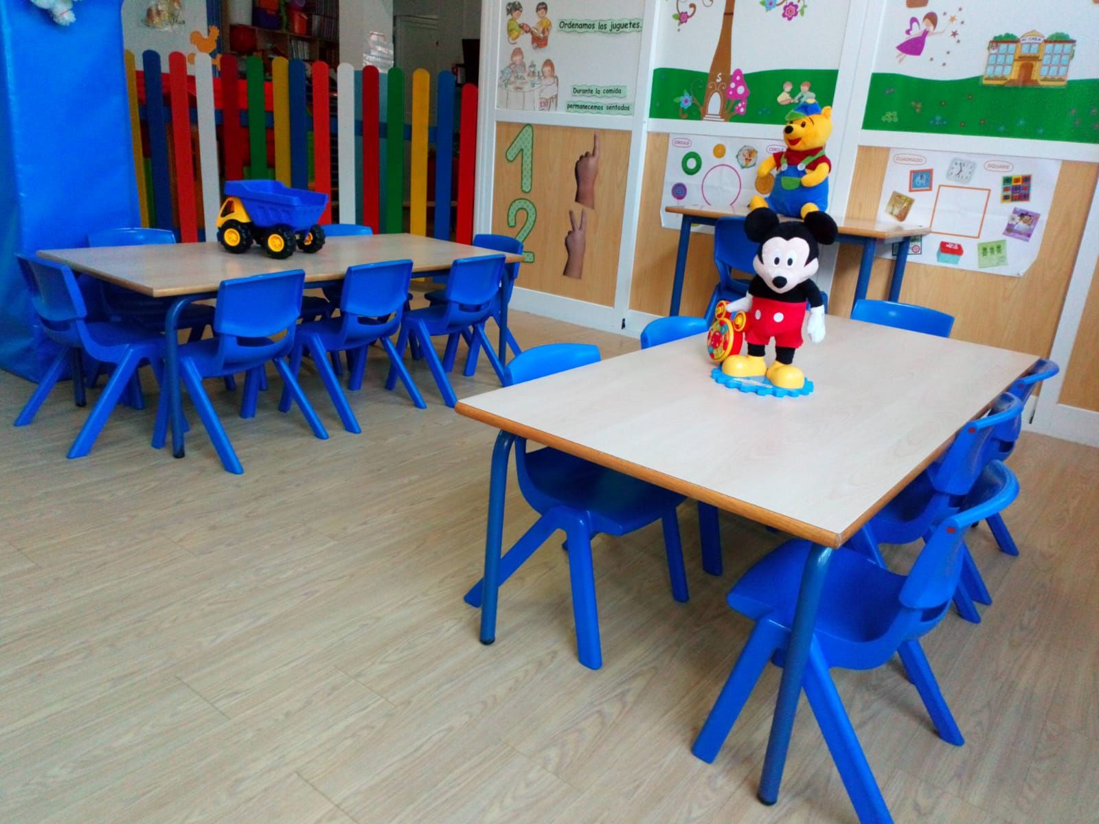 Aula con zona de aseo, juego y trabajo.